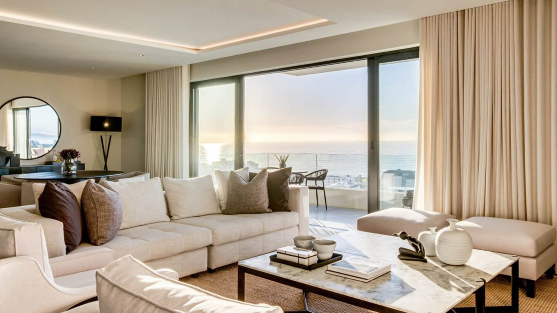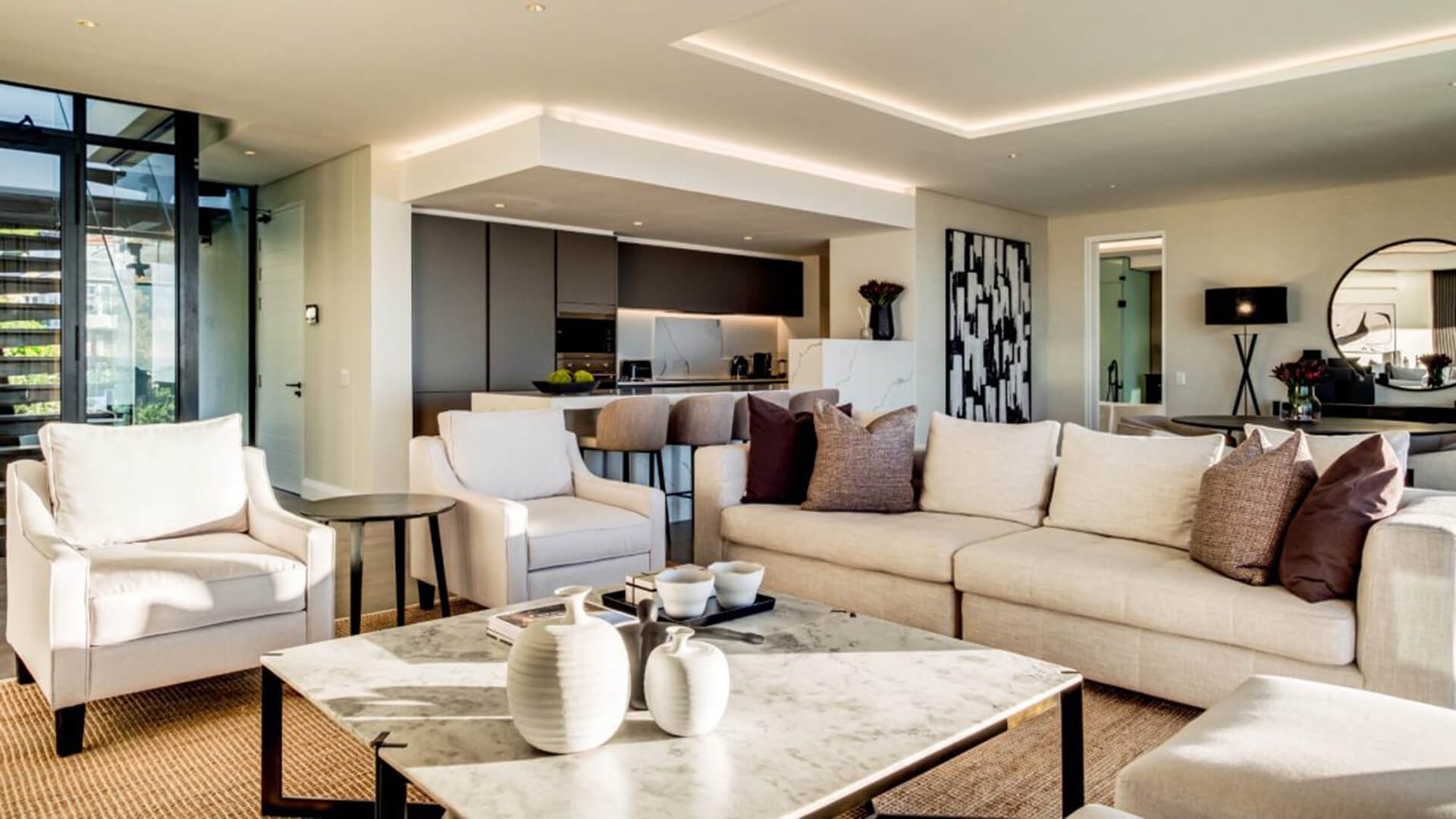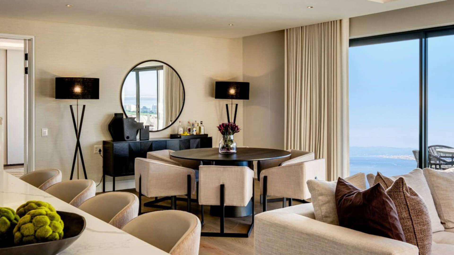 La zona giorno, ampia e luminosa, è progettata per favorire la socializzazione, con spazi fluidi che collegano armoniosamente gli ambienti interni e quelli esterni. Il design contemporaneo si distingue per l’uso di una palette cromatica dai toni morbidi e neutri, che esaltano la luminosità naturale e il legame con il paesaggio mediterraneo. I materiali scelti, di alta qualità, contribuiscono a creare un’atmosfera di lusso discreto, con attenzione ai dettagli e alla funzionalità.