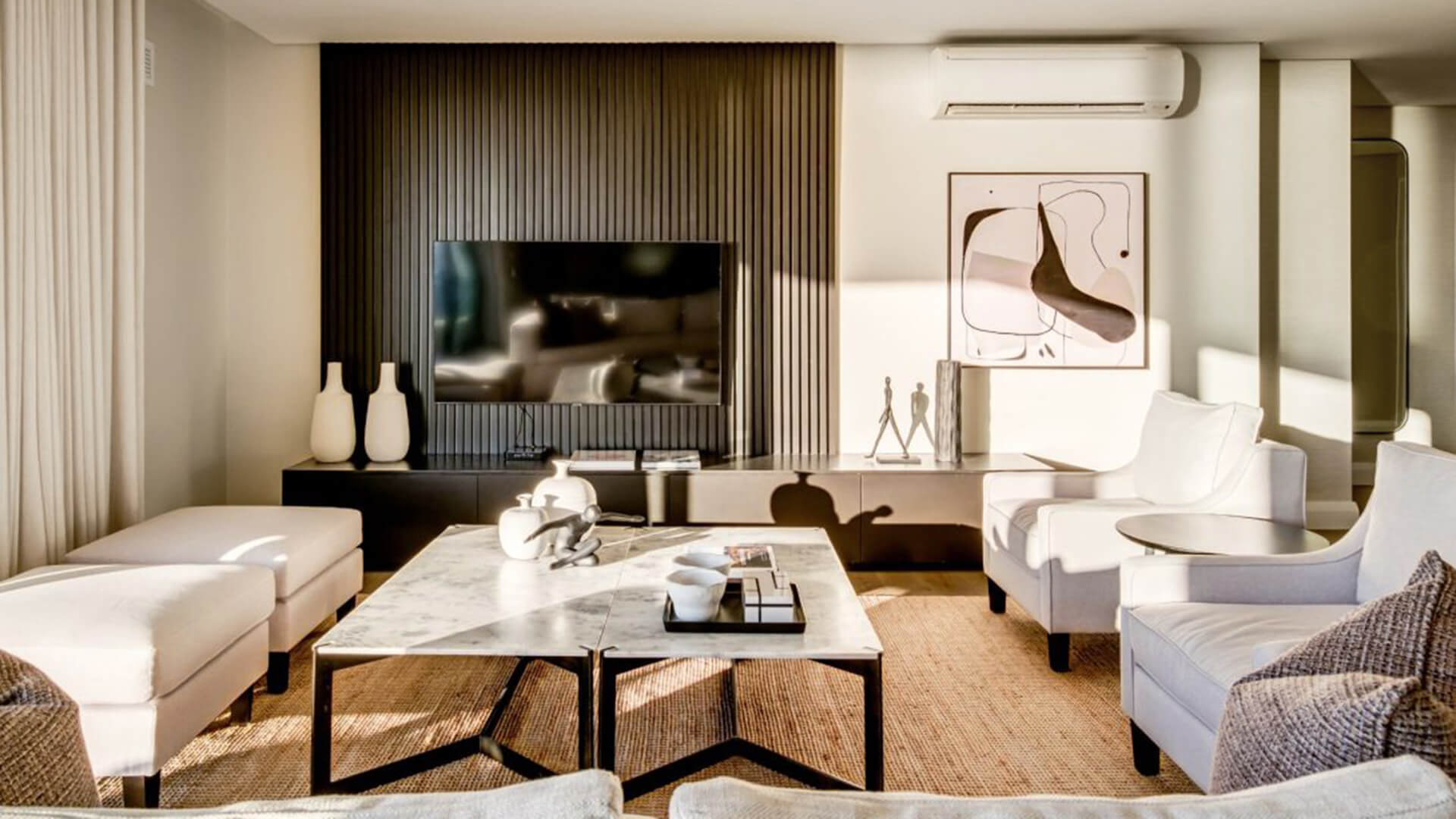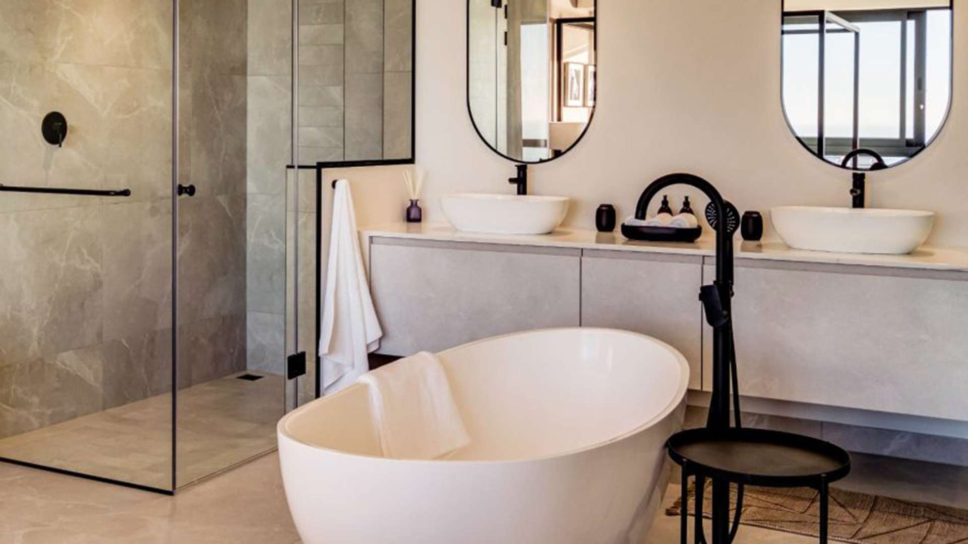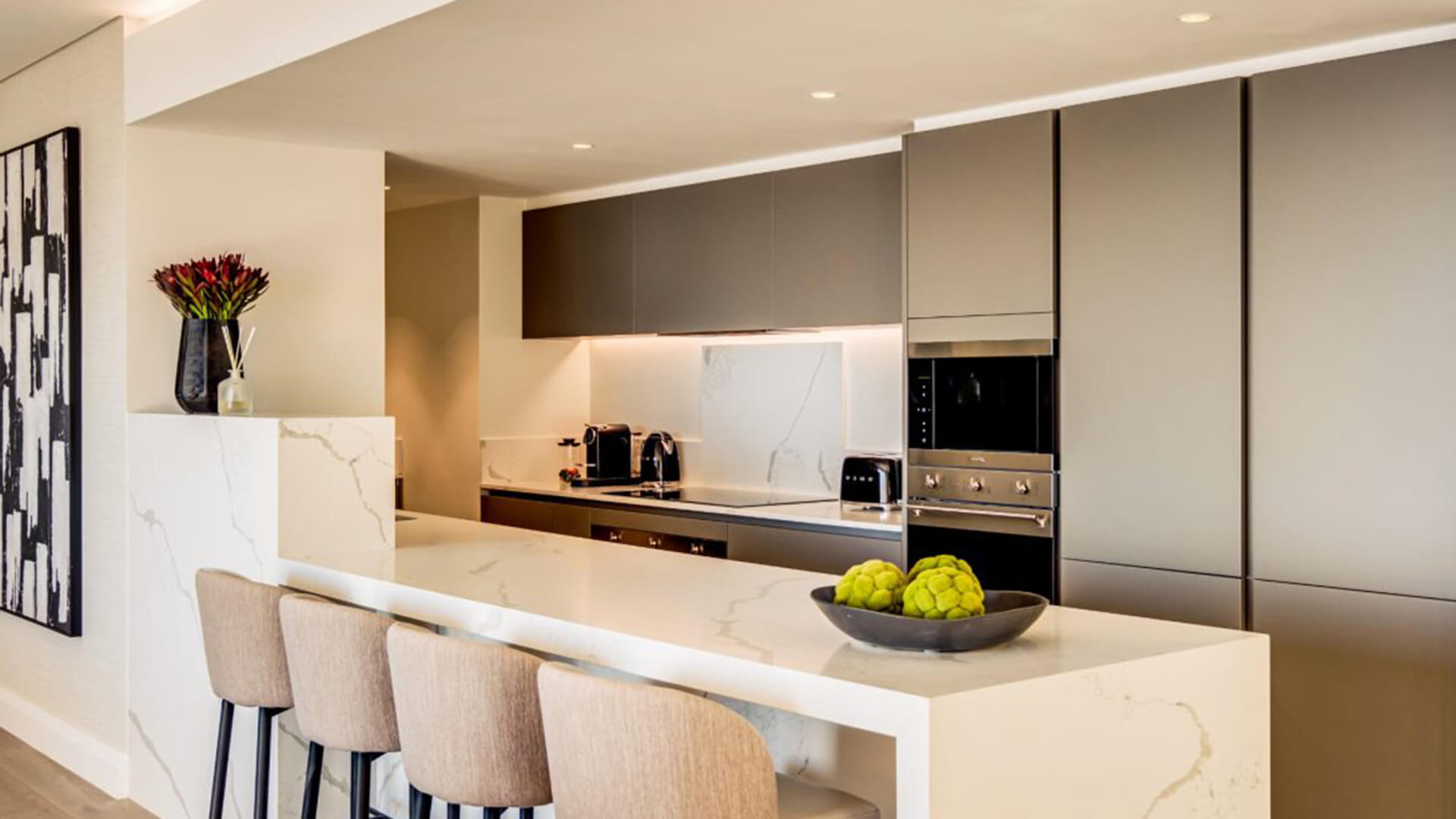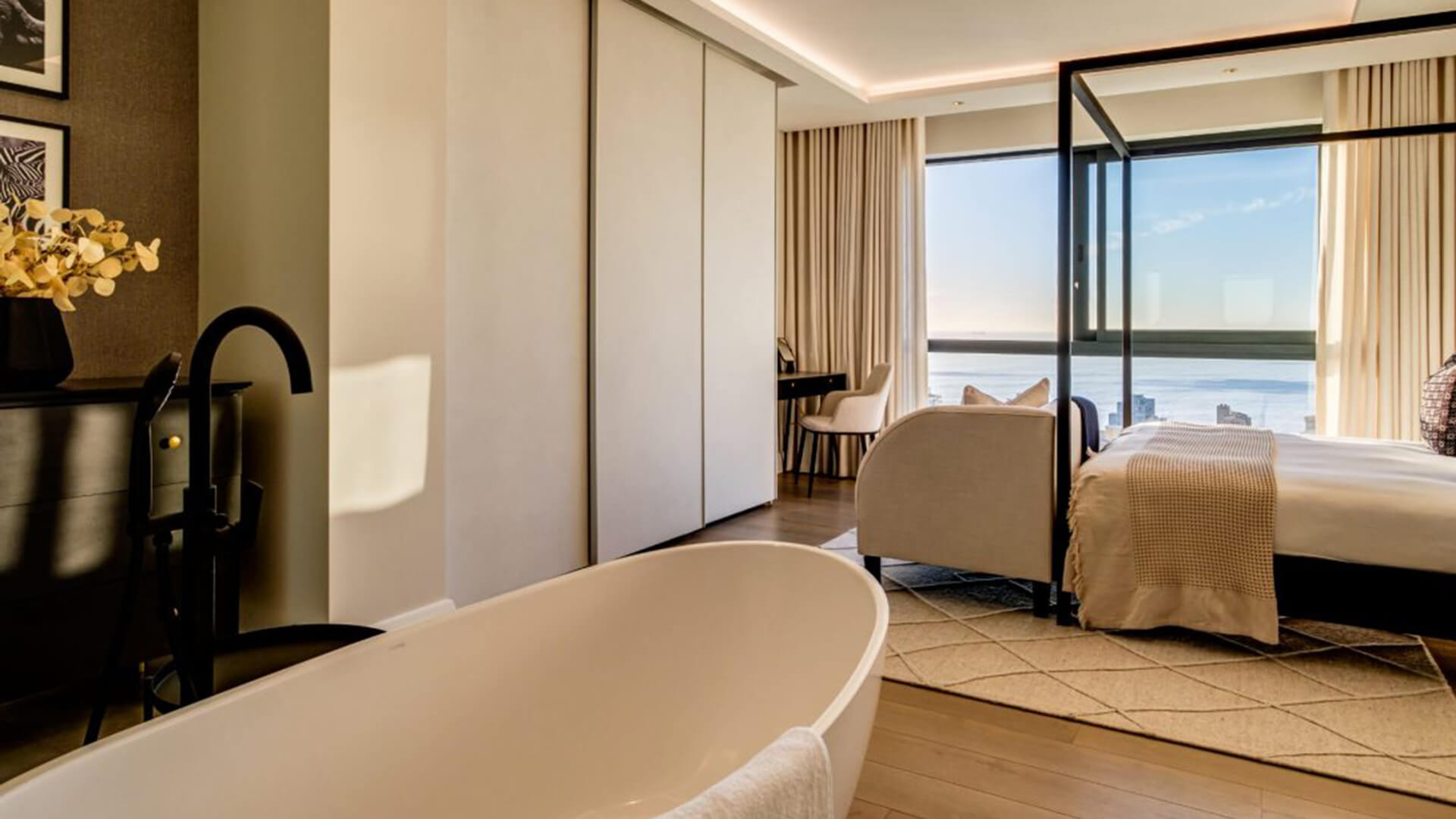 La zona giorno, ampia e luminosa, è progettata per favorire la socializzazione, con spazi fluidi che collegano armoniosamente gli ambienti interni e quelli esterni. Il design contemporaneo si distingue per l’uso di una palette cromatica dai toni morbidi e neutri, che esaltano la luminosità naturale e il legame con il paesaggio mediterraneo. I materiali scelti, di alta qualità, contribuiscono a creare un’atmosfera di lusso discreto, con attenzione ai dettagli e alla funzionalità.