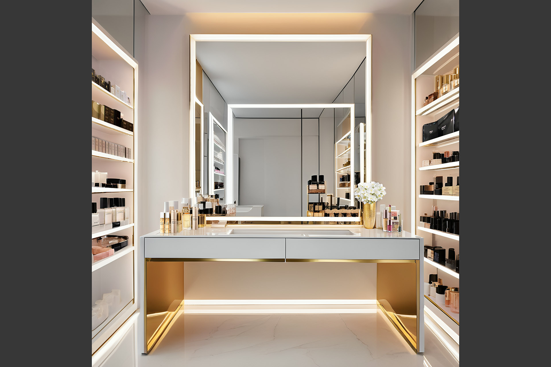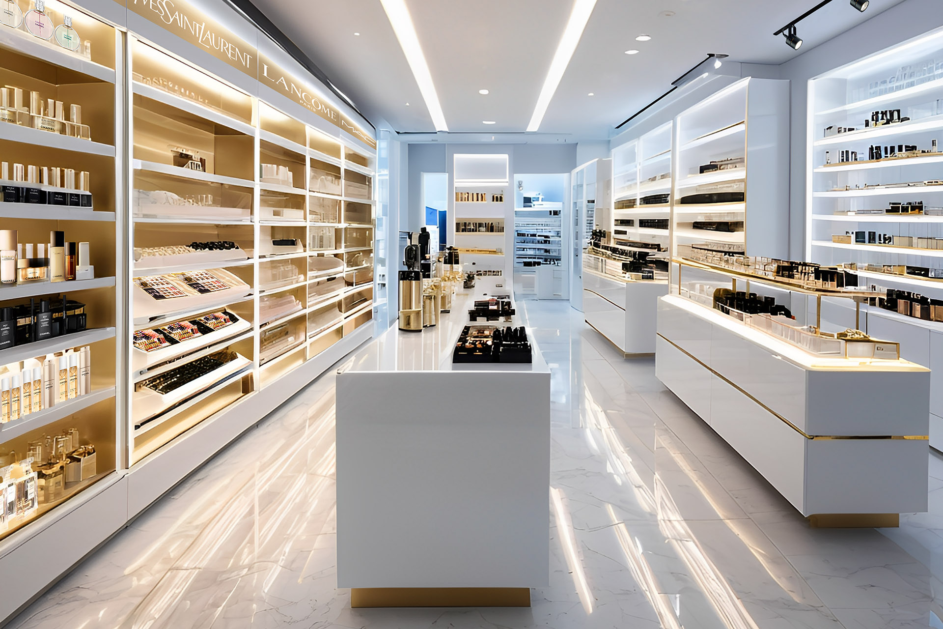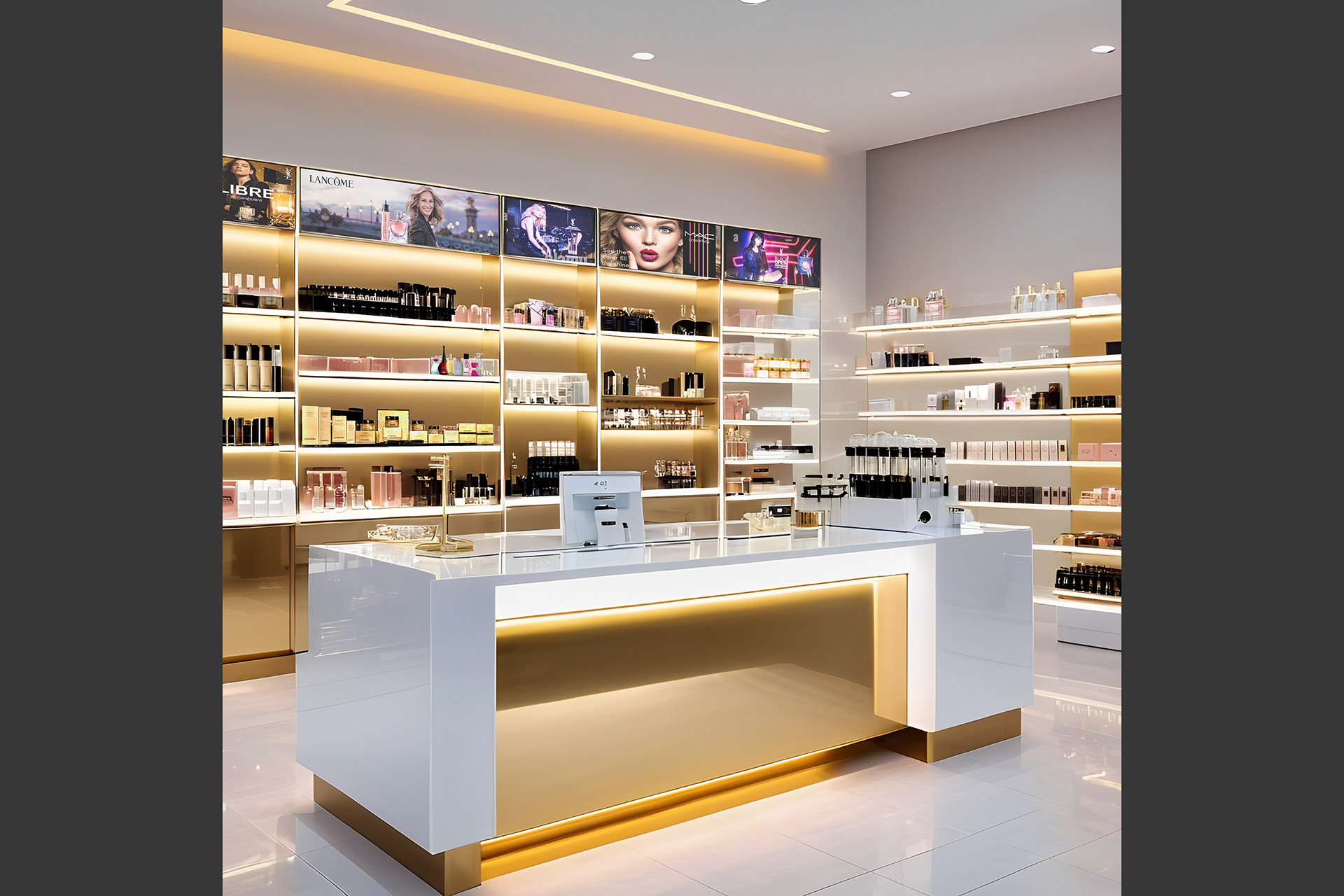 Progetto e ristrutturazione a Roma di profumeria con finiture luxury. Realizzazione di opere interne, impiantistica, con progettazione e fornitura di arredo su misura.